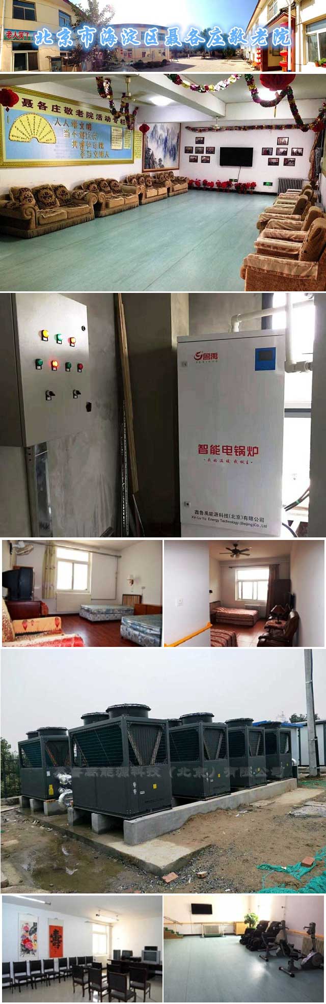 由于敬老院地處鳳凰嶺自然風(fēng)景公園”山腳下,占地面積有19.5畝,加之建筑面積為6000平方米的四合院型兩層樓房,末端為暖氣片散熱,所以該院建筑的透熱率較高,為了提高入住老人在院生活質(zhì)量,保證老人冬季溫暖舒適過冬,并落實海淀區(qū)煤改電政策,選用鑫魯禹超低溫空氣源熱泵機(jī)組進(jìn)行敬老院熱源設(shè)備改造。