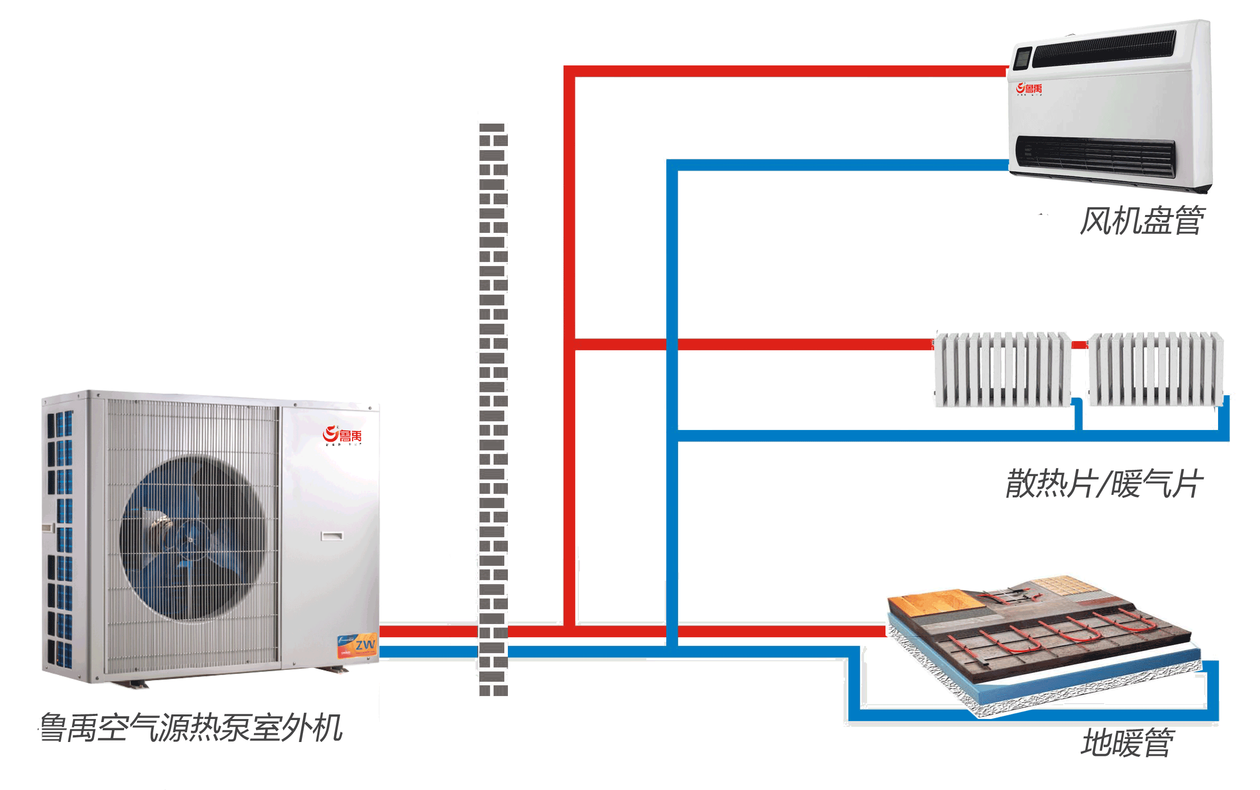 魯禹空氣源熱泵供暖的系統(tǒng)類型分三類: