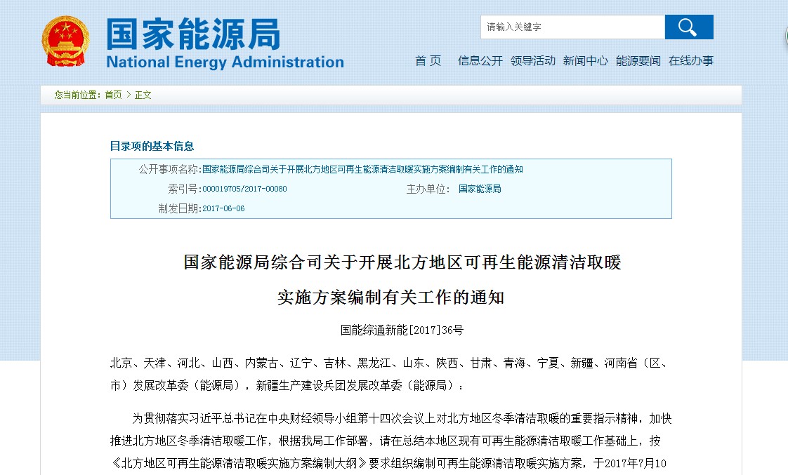 各地區要根據當地資源優勢和取暖需求,按集中供暖與分散取暖相結合的原則,確定適合當地實際的主推的可再生能源供暖方式。提出2017-2021年可再生能源清潔取暖的重大工程,列出各地區今年啟動的可再生能源清潔取暖工程,爭取一部分工程在2017年度供暖季前完工投入使用。