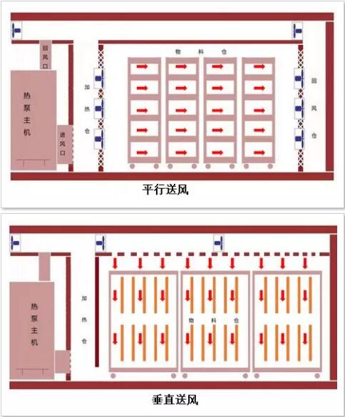采用適合的送風方式,設(shè)計合理的烘干房結(jié)構(gòu)才能順利烘干出產(chǎn)品,否則即使熱泵機組能力再強,也有可能出現(xiàn)物料干燥不均勻,或部分物料無法干燥的情況。