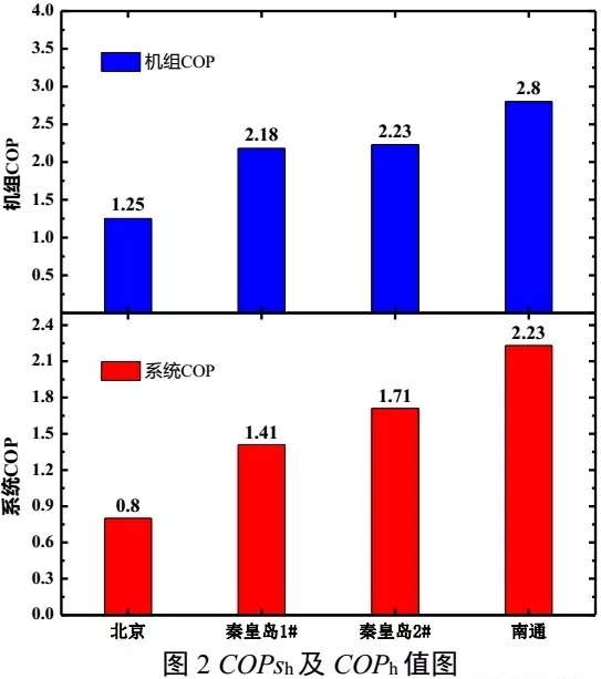 圖2給出測試項目的COPsh和COPh。由圖2可得,北京某辦公樓項目的COPh值最低,僅為1.25;秦皇島1#辦公樓、2#辦公樓項目COPh值分別為2.18、2.23;南通某辦公樓項目由于室外溫度較高,COPh值最高,達到2.8。