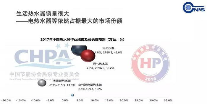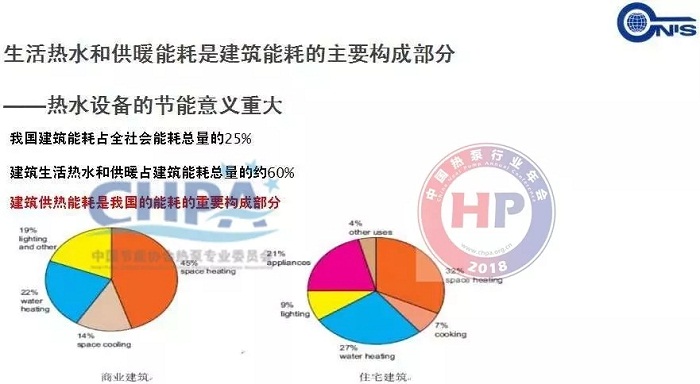 下面介紹一下國內(nèi)外相關(guān)標(biāo)準(zhǔn),據(jù)統(tǒng)計(jì),我國建筑能耗約占全社會(huì)能耗總量的25%,建筑生活熱水和供暖占建筑能耗總量的約60%,所以說,熱水和供暖設(shè)備的節(jié)能潛力非常巨大。據(jù)產(chǎn)業(yè)在線統(tǒng)計(jì)報(bào)告顯示,我國生活熱水器銷量非常大。2017年電熱水器銷售2788.3萬臺(tái),占熱水器銷量的45.6%,燃?xì)鉄崴饔?7.7%的增長(zhǎng),空氣源熱泵熱水器有2.5%的增長(zhǎng),銷售109.4萬臺(tái),占比1.8%。