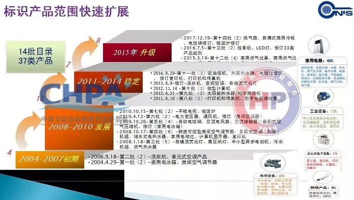 目前國家的節(jié)能標(biāo)準(zhǔn)有300余項(xiàng)(不含工程建設(shè)標(biāo)準(zhǔn)),其中強(qiáng)制性標(biāo)準(zhǔn)約占60%,其余為推薦性標(biāo)準(zhǔn)。重點(diǎn)包括:強(qiáng)制性能耗限額標(biāo)準(zhǔn)106項(xiàng)強(qiáng)制性能效標(biāo)準(zhǔn)65項(xiàng)。依據(jù)能效標(biāo)準(zhǔn),我國于2004年正式實(shí)施了強(qiáng)制性能效標(biāo)識(shí)管理制度,到目前為止已經(jīng)發(fā)布14批目錄,有37類產(chǎn)品納入到了能效標(biāo)識(shí)的目錄范圍。
