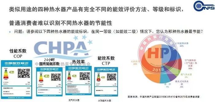 依據(jù)國家能效標(biāo)準(zhǔn),我國已經(jīng)實(shí)施了燃?xì)鉄崴鳌㈦姛崴鳌⑻柲軣崴骱蜔岜脽崴鞯哪苄?biāo)識(shí),但類似用途的四種熱水器產(chǎn)品有完全不同的能效評(píng)價(jià)方法、等級(jí)和標(biāo)識(shí),普通消費(fèi)者難以識(shí)別不同熱水器的節(jié)能性。根據(jù)2015年中國熱泵產(chǎn)業(yè)聯(lián)盟針對(duì)消費(fèi)者調(diào)查,49%的消費(fèi)者表示只觀察同樣標(biāo)注了2級(jí)的四種產(chǎn)品的標(biāo)識(shí),無法比較哪一個(gè)產(chǎn)品更節(jié)能。