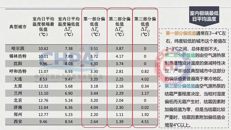 第一部分偏低值通常在3—4℃左右,緯度較低的城市這個差值在2—3℃之間,總體差別不大;第二部分偏低值則由空氣源熱泵制熱量隨室外溫度的衰減特性決定,嚴寒地區典型城市中這部分的偏低值要普遍高于寒冷地區;第三部分偏低值由空氣源熱泵的結霜嚴重程度決定,當相對濕度偏低而無霜產生時,結霜因素附加偏低值為零,但是當結霜比較嚴重時,結霜因素附加偏低值會增至4℃以上。