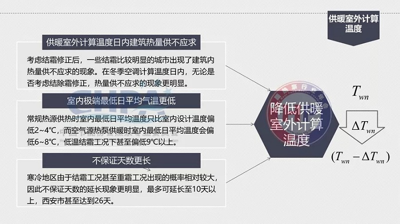實際上,在常規熱源供熱時,室內最低日平均溫度只比室內設計溫度偏低2—4℃,而空氣源熱泵供暖時室內最低日平均溫度會偏低6—8℃,低溫結霜工況下甚至偏低9℃以上。這樣的結果,怎么處理?不保證天數在其它供暖方式中都會出現。但是如果還是這樣去做,空氣源熱泵供暖不保證天數就會增加。
