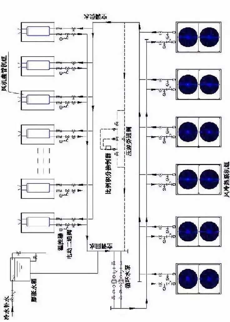 空調(diào)水系統(tǒng)為一次泵變流量、雙管制系統(tǒng),系統(tǒng)干管采用異程式。每層水系統(tǒng)的回水干管上設(shè)置平衡閥。每臺(tái)風(fēng)機(jī)盤管機(jī)組的回水管上設(shè)計(jì)電動(dòng)二通閥。風(fēng)機(jī)盤管的供水量控制由室內(nèi)溫控器按所需的室溫來控制。空調(diào)冷熱水系統(tǒng)定壓補(bǔ)水裝置采用高位的膨脹水箱。