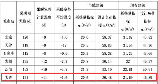 以大連市的一處1000平米節能建筑為例,根據上圖《全國主要城市采暖期耗熱量指標和采暖設計熱負荷指標》,大連市節能建筑每平方米采暖季供暖所需熱能為20.6w/㎡*24h*131d/1000=64.77kwh/㎡
